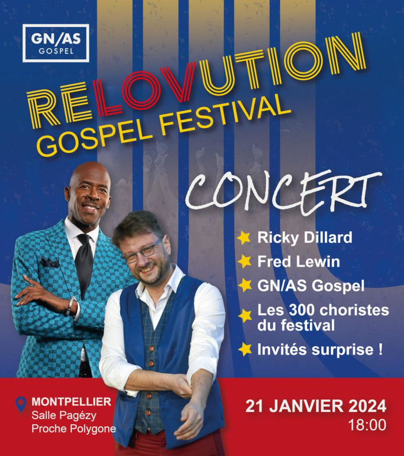 En clôture du 1er RELOVUTION GOSPEL FESTIVAL, la chorale GN/AS Gospel propose un concert unique en France, avec la participation exceptionnelle, du chef de choeur référence aux USA depuis 30 ans : Dr Ricky 'The Choirmaster' Dillard, les 400 chanteurs du Festival et Fred Lewin. Des invités de renom du Gospel Européen seront présents également pour proposer une soirée Gospel inoubliable. Un moment de partage unique autour du message de Foi des chants de Gospel. Une bonne manière de commencer l'année 2024 sous le signe de la Joie et de l'Espérance!