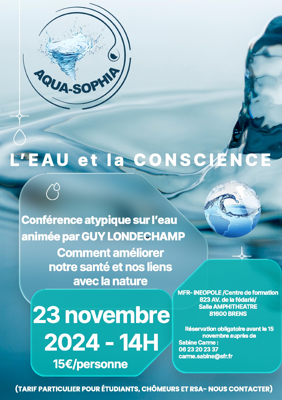 Sa conférence intitulée, « l’eau et la conscience » abordera les sujets liés aux pollutions chimiques et physique de notre eau, extérieures et intérieures, altérant notre santé et nos liens sociaux…la biodiversité est gravement altérée, des espèces animales et végétales disparaissent sans cesse et l’espèce humaine est elle-même aujourd’hui menacée par cette inconscience. Notre bien commun et vital est en train de devenir un bien de marchandisation et de spéculation. La financiarisation de l’eau est en train de devenir une menace pour les droits humains. Est-il déjà trop tard ? Non : tout chante et danse dans l’univers, même nos protéines et spécialement notre ADN, notre ADN ne fonctionne pas sans son eau précise le docteur Londechamp. Selon lui, si l’eau est le médium incontournable de toute vie dans la forme, elle l’est aussi de la conscience qui habite cette forme et de sa cohérence. |