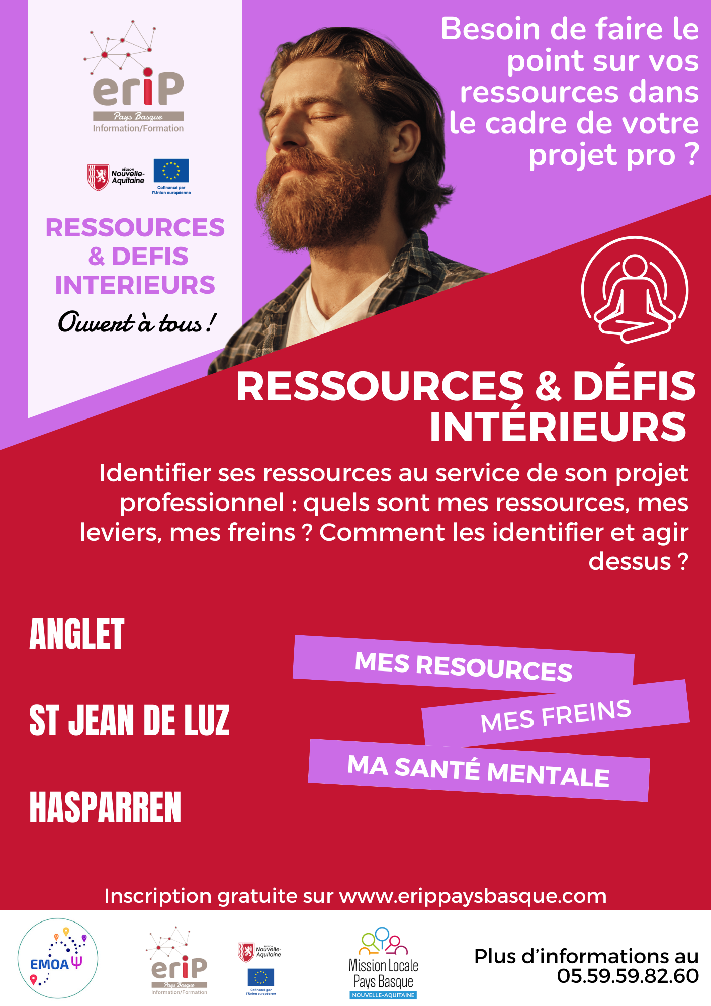 RESSOURCES & DÉFIS INTÉRIEURS Besoin de faire le point sur vos ressources dans le cadre de votre projet pro ? Identifier ses ressources au service de son projet professionnel : quels sont mes ressources, mes leviers, mes freins ? Comment les identifier et agir dessus ? L'atelier "Ressources & défis intérieurs" animé par l'équipe de EMOA Psy, peut vous apporter des éléments afin de prendre en compte votre santé mentale dans le cadre de votre projet d'évolution professionnelle |