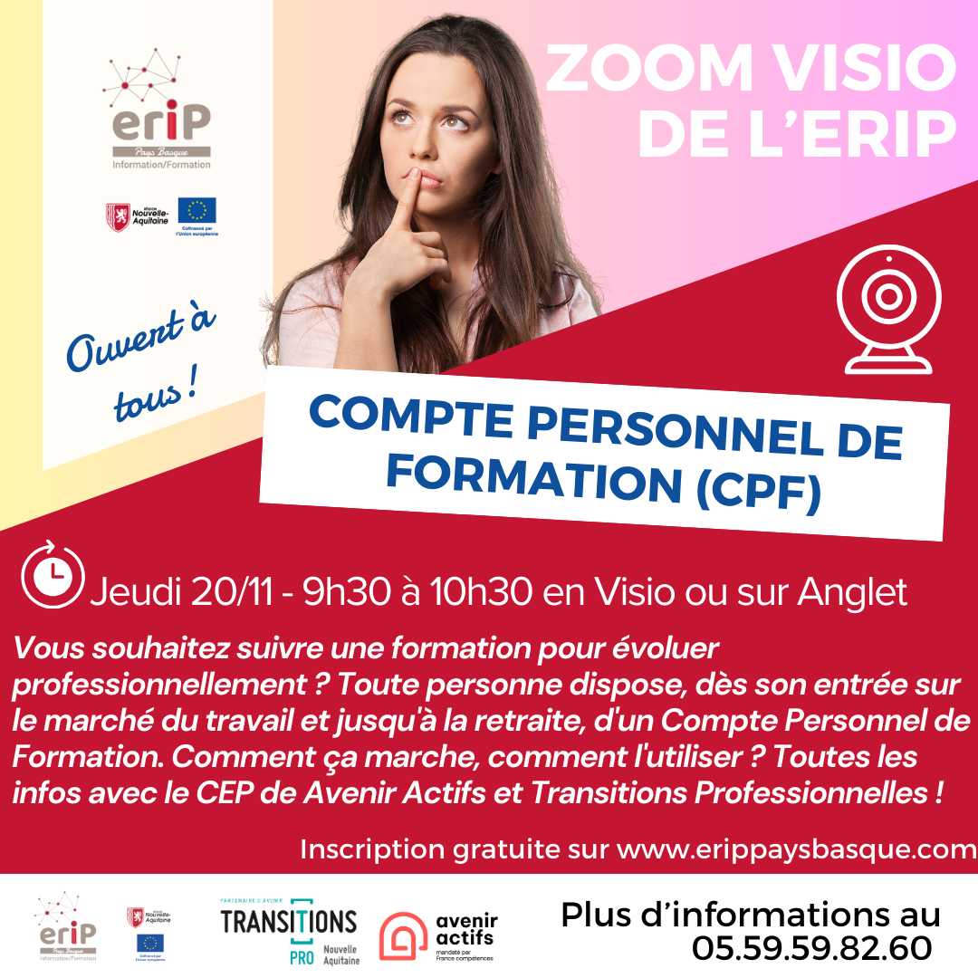 Zoom Visio Compte Personnel de Formation (CPF) Vous souhaitez suivre une formation pour évoluer professionnellement ? Toute personne dispose, dès son entrée sur le marché du travail et jusqu'à la retraite, d'un Compte Personnel de Formation. Comment ça marche, comment l'utiliser ? Toutes les infos avec le CEP de Avenir Actifs et Transitions Professionnelles ! |