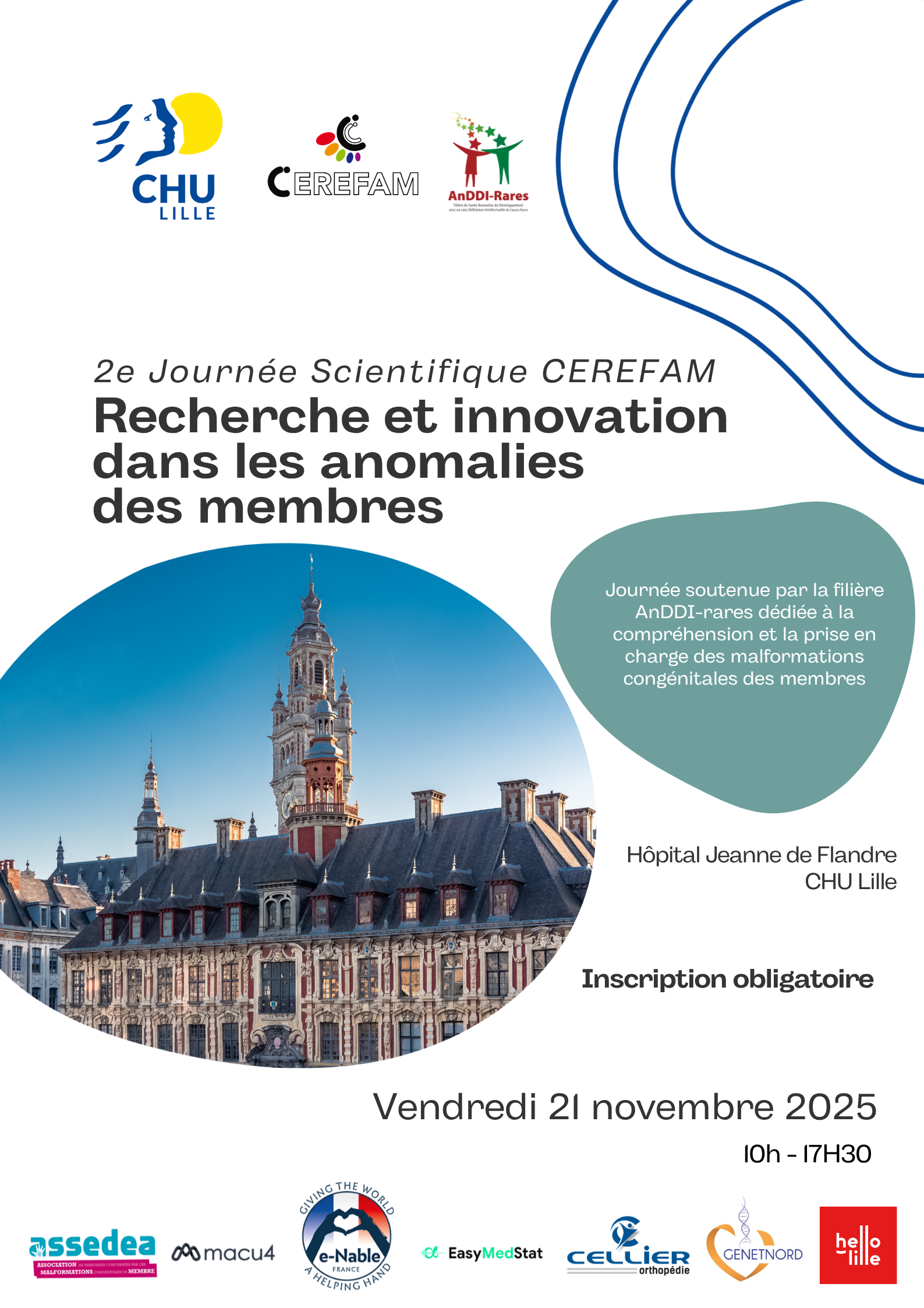 Cet événement est organisé en collaboration avec les centres de référence et de compétence maladies rares « Anomalies des membres » du réseau CEREFAM, l’association ASSEDEA et le CHU de Lille. Il sera dédié aux dernières avancées en matière de recherche et d'innovation dans le domaine des anomalies des membres. Cette journée sera l’occasion de partager à l’échelle nationale les initiatives locales et favoriser de nouvelles collaborations entre les centres.