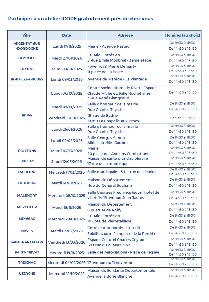 ATELIERS ICOPE19 - DÉCOUVREZ DÈS À PRESENT ICOPE EN VOUS INSCRIVANT A UN ATELIER COLLECTIF PRES DE CHEZ VOUS !