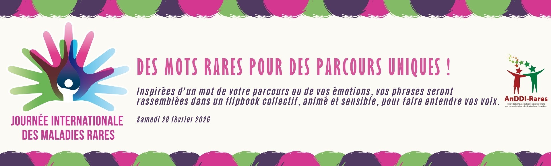 Cette année, notre ambition est de mettre en lumière les mots qui racontent votre parcours avec une maladie rare à travers la création d'un flipbook numérique collectif.