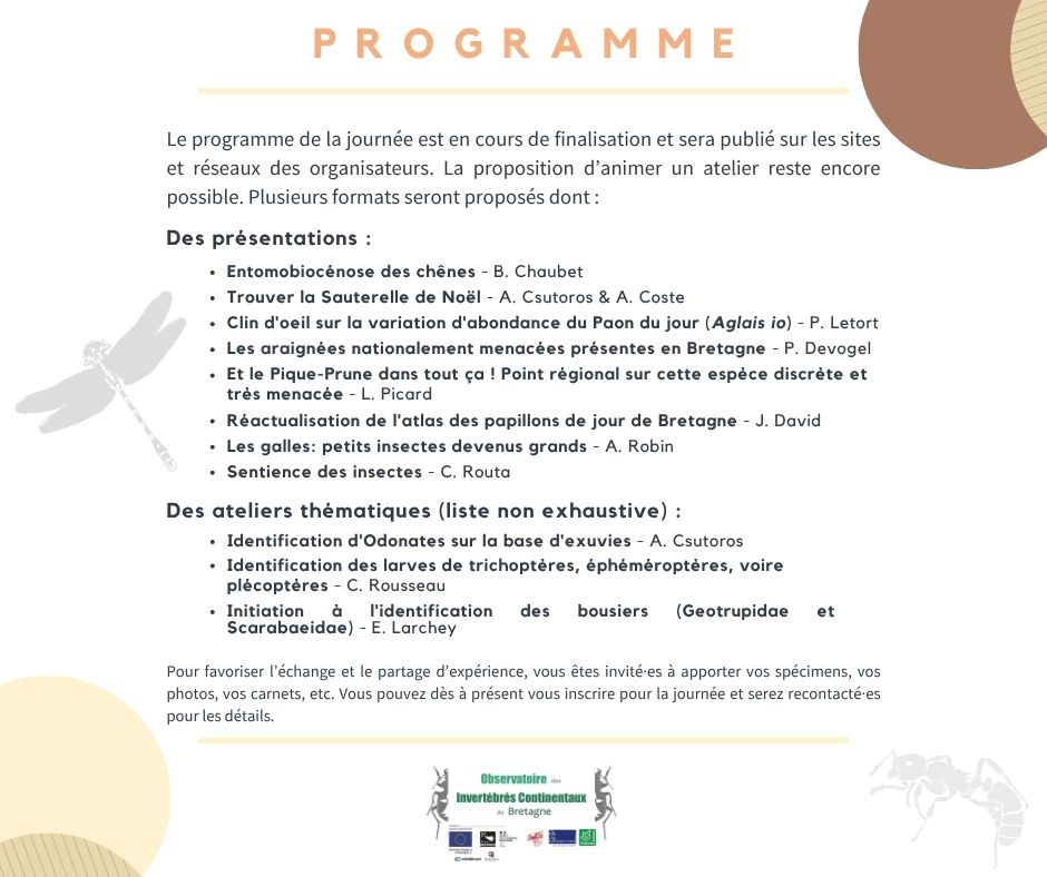Rencontres Invertébristes de Bretagne - édition 2025 Inscrivez vous à la journée et vous serez recontacté·es à partir du mercredi 15 octobre afin de choisir vos ateliers. |