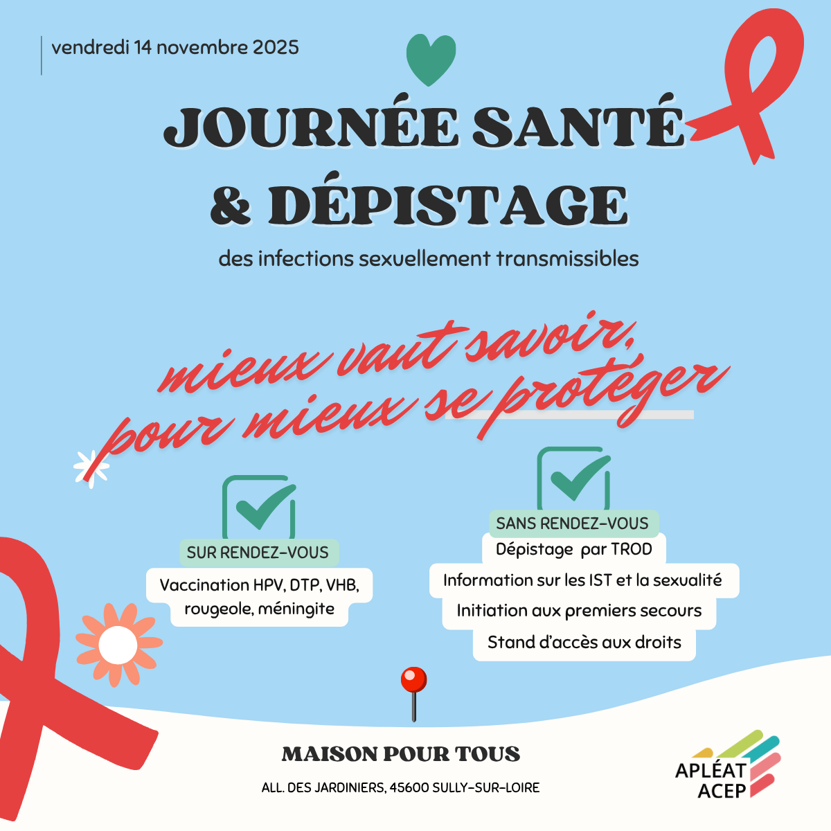 Journée Santé & Dépistage IST – Sully-sur-LoireVendredi 14 novembre 2025 Maison Pour Tous – Allée des Jardiniers, 45600 Sully-sur-Loire Horaires des rendez-vous : 10h–12h30 et 13h30–15h30 (créneaux de 20 minutes)