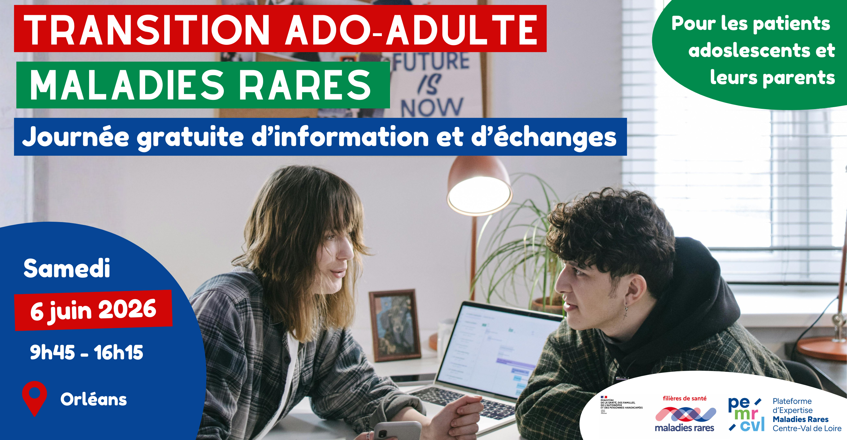 Venez rencontrer d'autres adolescents/jeunes adultes et parents pendant une journée d'information et de partage sur la transition ado-adulte à l'hôpital, le samedi , de 9h45 à 16h15, au CHU d'Orléans (salle Polyvalente - niveau -1 - 14 Av. de l'Hôpital, 45100 Orléans).