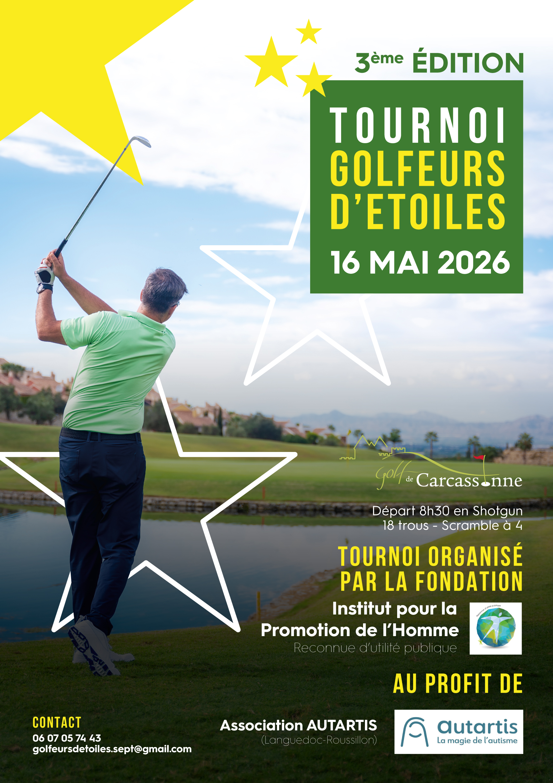 Nous avons le plaisir de vous annoncer l’organisation d’un tournoi de golf caritatif au profit de l’association AUTARTIS, dont le siège est situé à Servian.Cet événement a pour objectif de soutenir un projet de développement dédié à l’accompagnement des enfants autistes, en contribuant à améliorer leur quotidien, leur épanouissement et leur inclusion. Les fonds récoltés lors de cette journée seront intégralement reversés à l’association afin de financer des actions concrètes en faveur des enfants et de leurs familles. LES GOLFEURS D'ETOILES Tél : 06 07 05 74 43 |