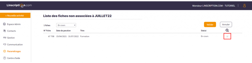 Pour appliquer le code à une fiche activité, on clique sur le pictogramme du crayon de la ligne concernée, on clique sur + Associer des fiches. On sélectionne la fiche activité que l’on souhaite et ensuite on clique sur Valider pour appliquer le code à celle-ci.