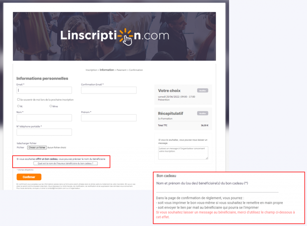 Côté internaute, il lui suffit de s’inscrire, de cliquer sur Quel est le nom de l’heureux bénéficiaire du bon cadeau ?, de renseigner le Nom et le prénom du bénéficiaire. Dans la page de confirmation de règlement, vous pourrez imprimer le bon vous-même si vous souhaitez le remettre en main propre, soit envoyer le lien par email au bénéficiaire qui pourra se l’imprimer. Si vous le souhaitez, vous pouvez ajouter un petit message au bénéficiaire.