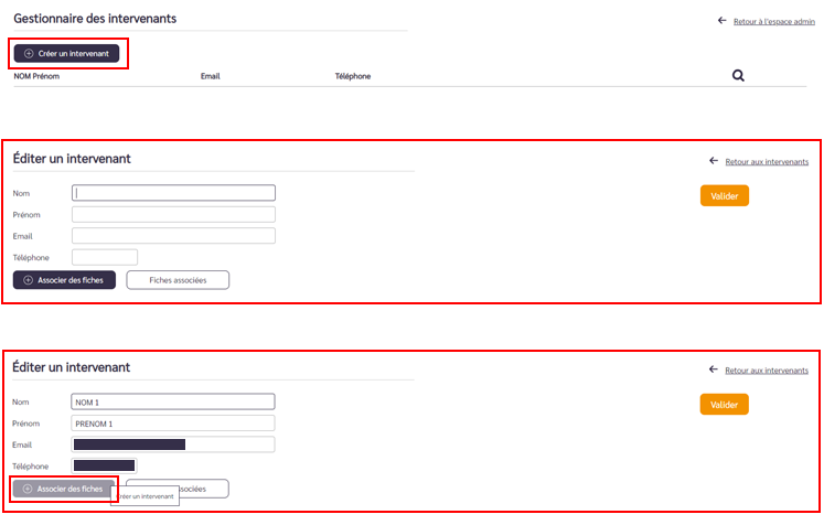 Cliquez sur Créer un intervenant, renseignez les informations de l’intervenant : Nom, Prénom, email et numéro de téléphone.