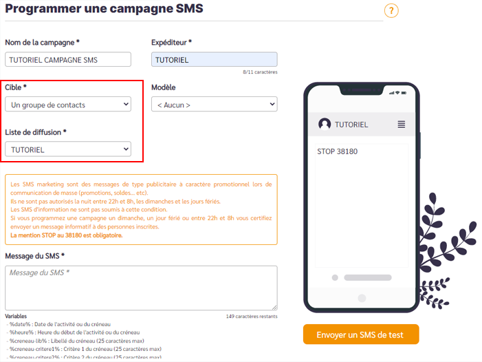Choisissez un modèle si vous en avez et renseignez la Cible à laquelle vous souhaitez envoyer la campagne SMS :